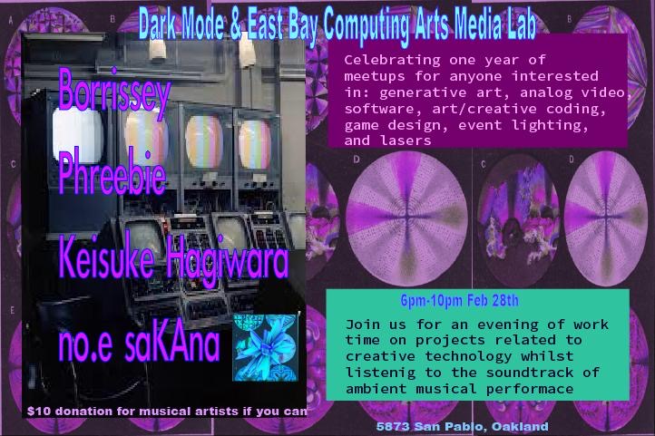 Celebrating 1 year of meetups for anyone interested in generative art, analog video, music software, art/creative coding, game design, event lighting, lasers